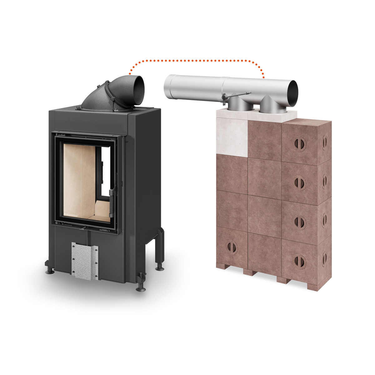 Klíčovým prvkem systému jsou speciální tvarovky s výjimečnou tepelnou vodivostí a vysokou objemovou hmotností (2750 kg/m³). Tyto moduly se instalují mezi kamnovou vložku a komín, kde rychle akumulují teplo ze spalin a poté jej postupně uvolňují do prostoru. Možnost montáže na pravou i levou stranu topeniště zajišťuje modulárnost při plánování realizace. Celková hmotnost systému činí přibližně 330 kg, délka spalinové cesty dosahuje 4 m, doporučená teplosměnná plocha topidla je pak minimálně 5 m².